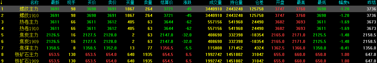 13日螺紋1910收3691跌45,供強(qiáng)需弱的趨勢明顯,預(yù)計(jì)期螺續(xù)跌;熱卷1910收3611跌62,鐵礦石收653.5漲6.5